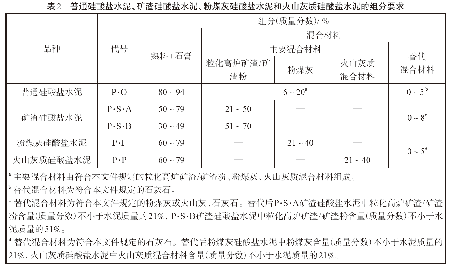 本次標(biāo)準(zhǔn)修訂為:主要混合材料的允許摻量為大于等于6% 且小于等于20%,其中可以使用小于等于5%的替代混合材料替代主要混合材料。這里的主要混合材料是指符合標(biāo)準(zhǔn)規(guī)定的粒化高爐礦渣/ 礦渣粉、粉煤灰、火山灰質(zhì)混合材料,可以是一種材料單獨(dú)使用也可以是兩種或三種材料復(fù)合使用。替代混合材料則指石灰石。具體見表2 中的備注a和b。