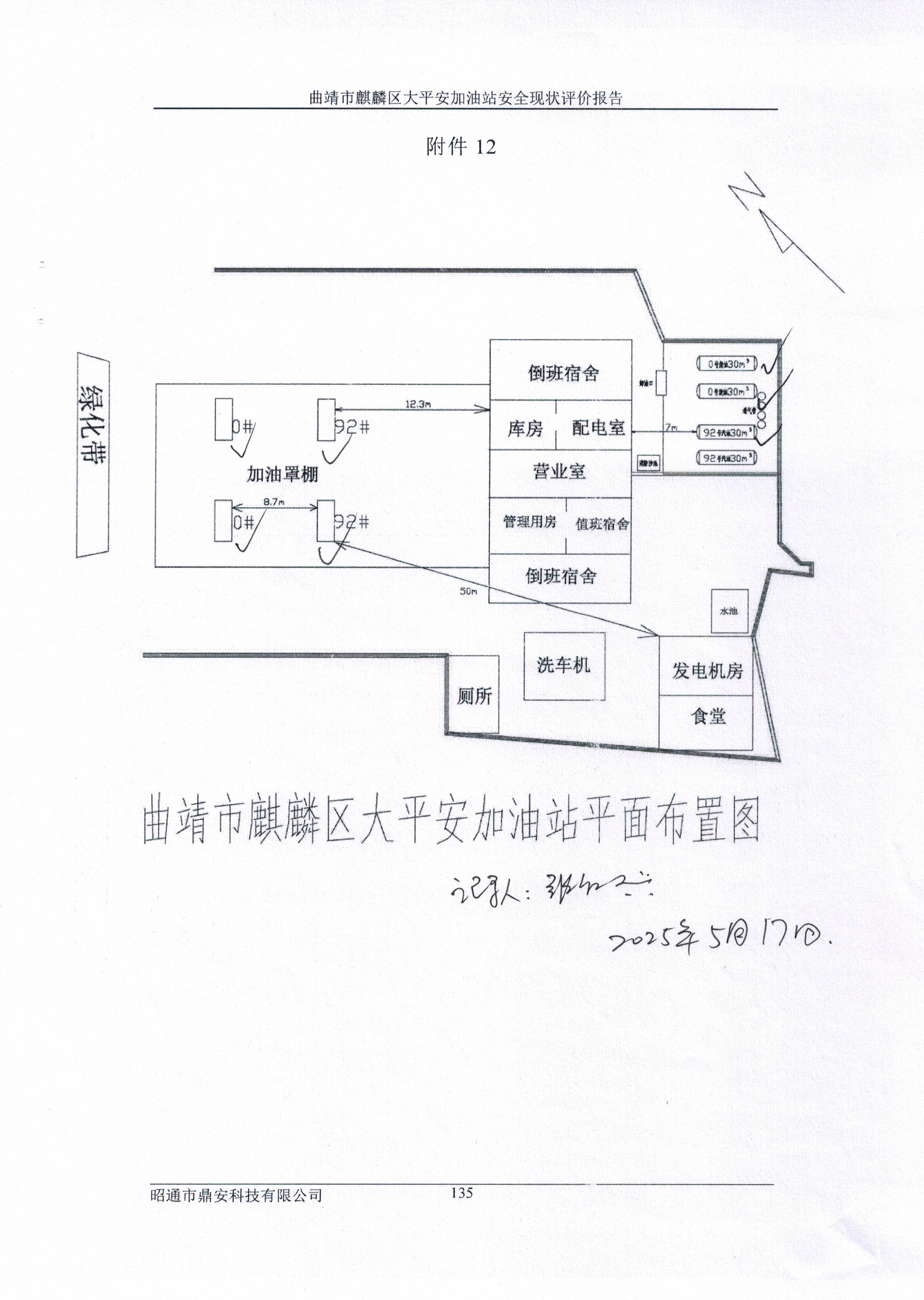 評價結論為:曲靖市麒麟區大平安加油站已完成本次評價發現的不符合項整改,站址選擇及平面布置、加油工藝及設施、消防設施、電氣及報警系統、建(構)筑物等方面符合《汽車加油加氣加氫站技術標準》(GB50156-2021)、《加油站作業安全規范》(AQ3010-2022)標準規定;經營場所、危險化學品儲存設施、人員配置及培訓考核、安全管理制度、安全操作規程、應急預案、應急物資滿足《危險化學品安全管理條例》(國務院令第591號,第645號修改)第三十四條、《危險化學品經營許可證管理辦法》(原國家安監總局令第55號公布,第79號修正)第六條要求,從安全的角度曲靖市麒麟區大平安加油站具備危險化學品經營的安全條件。 |